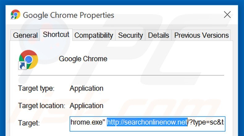 This browser hijacker modifies the "Target" field of the Google Chrome shortcut. To fix this, locate the shortcut on your Desktop and click the right mouse button over it. In the opened menu, choose "Properties". In the opened window, locate the Target field and eliminate all text (hxxp://www.searchonlinenow.net/...), which is entered after "C:\Program Files\Google\Chrome\Application\chrome.exe"
