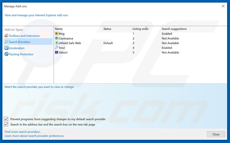 (at the top right corner of Internet Explorer), select "Manage Add-ons". In the opened window, select "Search Providers", set "Google", "Bing" or any other preferred search engine as your default, then remove "searchonlinenow".