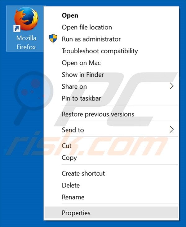 This browser hijacker changes the "Target" field of the Mozilla Firefox shortcut. To fix this, locate the shortcut on your Desktop and click the right mouse button over it. In the opened menu, choose "Properties". In the opened window, locate the Target field and eliminate all text (hxxp://www.didisearch.com/...), which is entered after "C:\Program Files\Mozilla Firefox\firefox.exe"