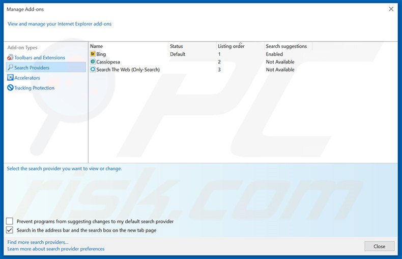 (at the top right corner of Internet Explorer), select "Manage Add-ons". In the opened window, select "Search Providers", set "Google", "Bing", or any other preferred search engine as your default and then remove "OneSearch".