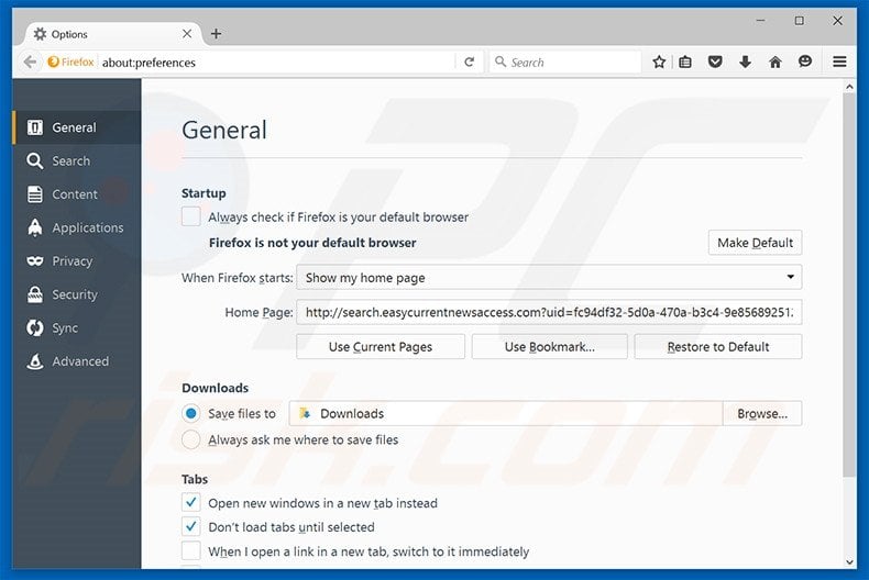 (at the top right corner of the main window), then select "Options", in the opened window, remove hxxp://search.easycurrentnewsaccess.com and enter your preferred domain, which will open each time you start Mozilla Firefox.
