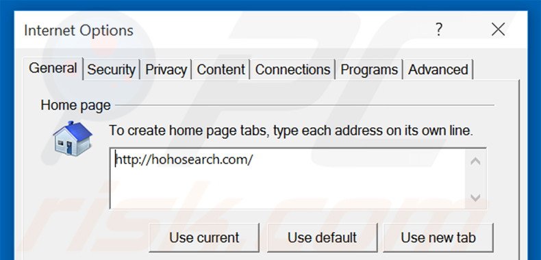 (at the top right corner of Internet Explorer), select "Internet Options", in the opened window, remove hxxp://www.hohosearch.com and enter your preferred domain, which will open each time you launch Internet Explorer.