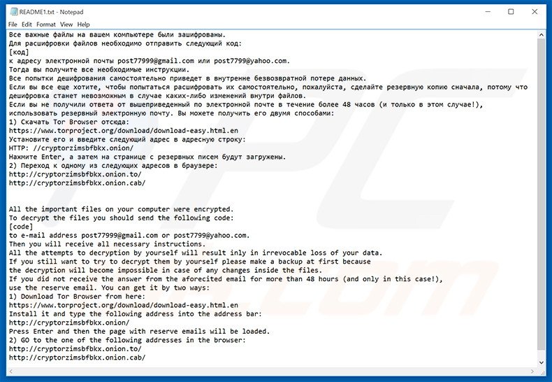 This, however, is rare. In most cases, ransomware infections deliver more direct messages simply stating that data is encrypted and that victims must pay some sort of ransom. Note that ransomware-type infections typically generate messages with different file names (for example, "_readme.txt", "READ-ME.txt", "DECRYPTION_INSTRUCTIONS.txt", "DECRYPT_FILES.html", etc.). Therefore, using the name of a ransom message may seem like a good way to identify the infection. The problem is that most of these names are generic and some infections use the same names, even though the delivered messages are different and the infections themselves are unrelated. Therefore, using the message filename alone can be ineffective and even lead to permanent data loss (for example, by attempting to decrypt data using tools designed for different ransomware infections, users are likely to end up permanently damaging files and decryption will no longer be possible even with the correct tool).